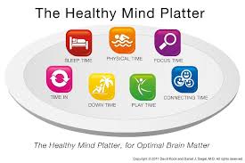 The Healthy Mind Platter Helps us balance (and carve) out time for things that are important to us and our functioning. Like all great things, balance of these 7 essential times (Sleep, Physical, Focus, In, Play, Down and Connecting) is essential for optimal brain functioning. Lately I have been COMPLETELY off balance (with food, life, and exercise)... So I become motivated to start working on balancing my plate.